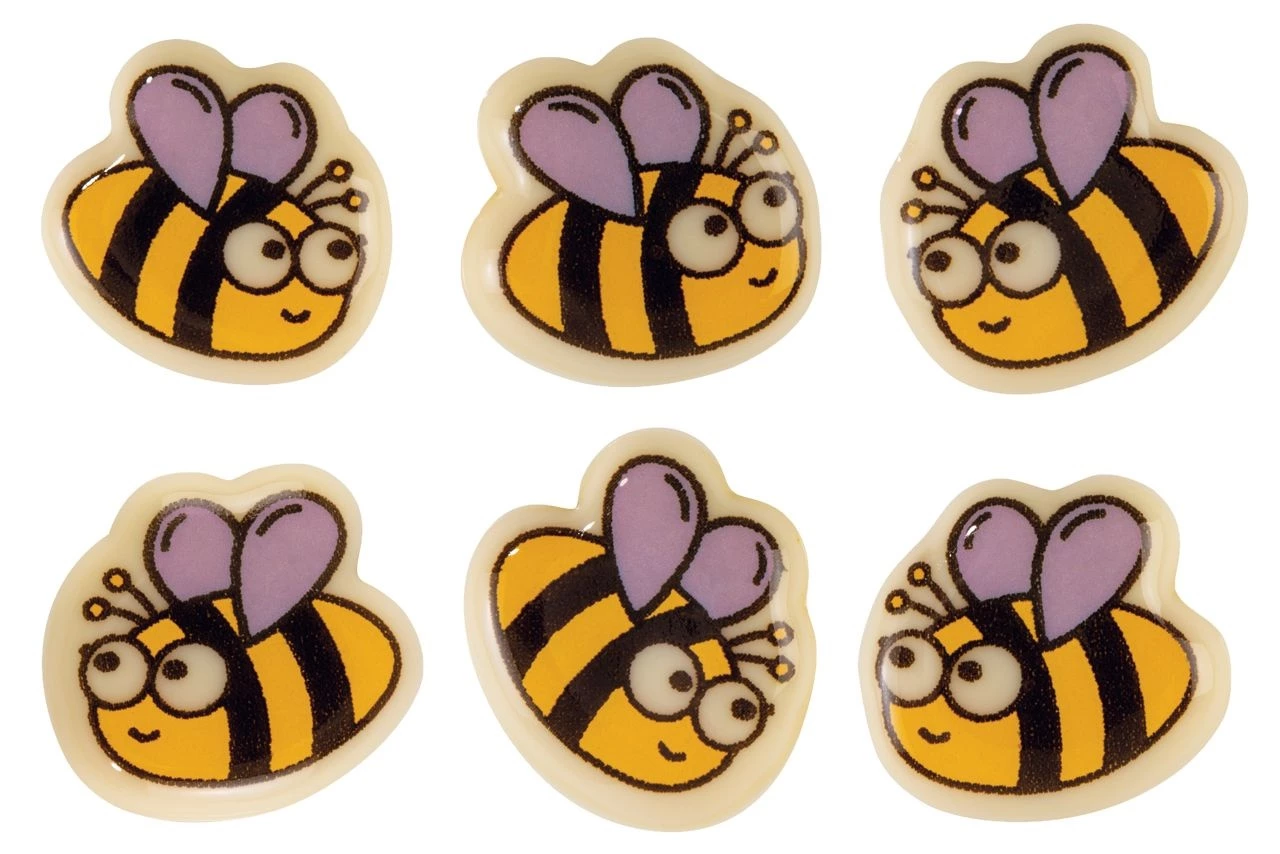 Diese niedlichen Bienchen aus weißer Schokolade sind mit Lebensmittelfarbe bedruckt und fliegen Ihnen garantiert nicht davon. Diese schokoladigen Insekten werden Ihren Kuchen und Desserts eine herrlich sommerliche Note verleihen.