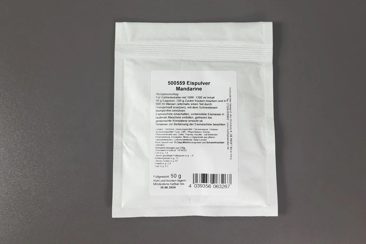 Eispulver für ein Speiseeis mit dem typischen Geschmack der Mandarine.