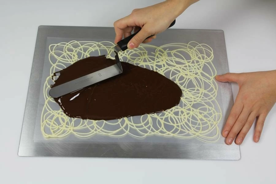 Pralinen, Kuchen und Desserts werden zum echten Blickfang, wenn Sie mit Ihrem selbst gemachten Schokodekor verziert werden. Einfach individuelle Muster auf die stabile Folie mit Kuvertüre spritzen und trocknen lassen. Sobald die Kuvertüre fest ist, ziehen Sie die Folie vorsichtig ab. Die lebensmittelechte Folie ist mehrfach verwendbar. Nicht spülmaschinengeeignet, mit feuchtem Tuch leicht abwischen. Lieferung ohne silberne Unterlage.