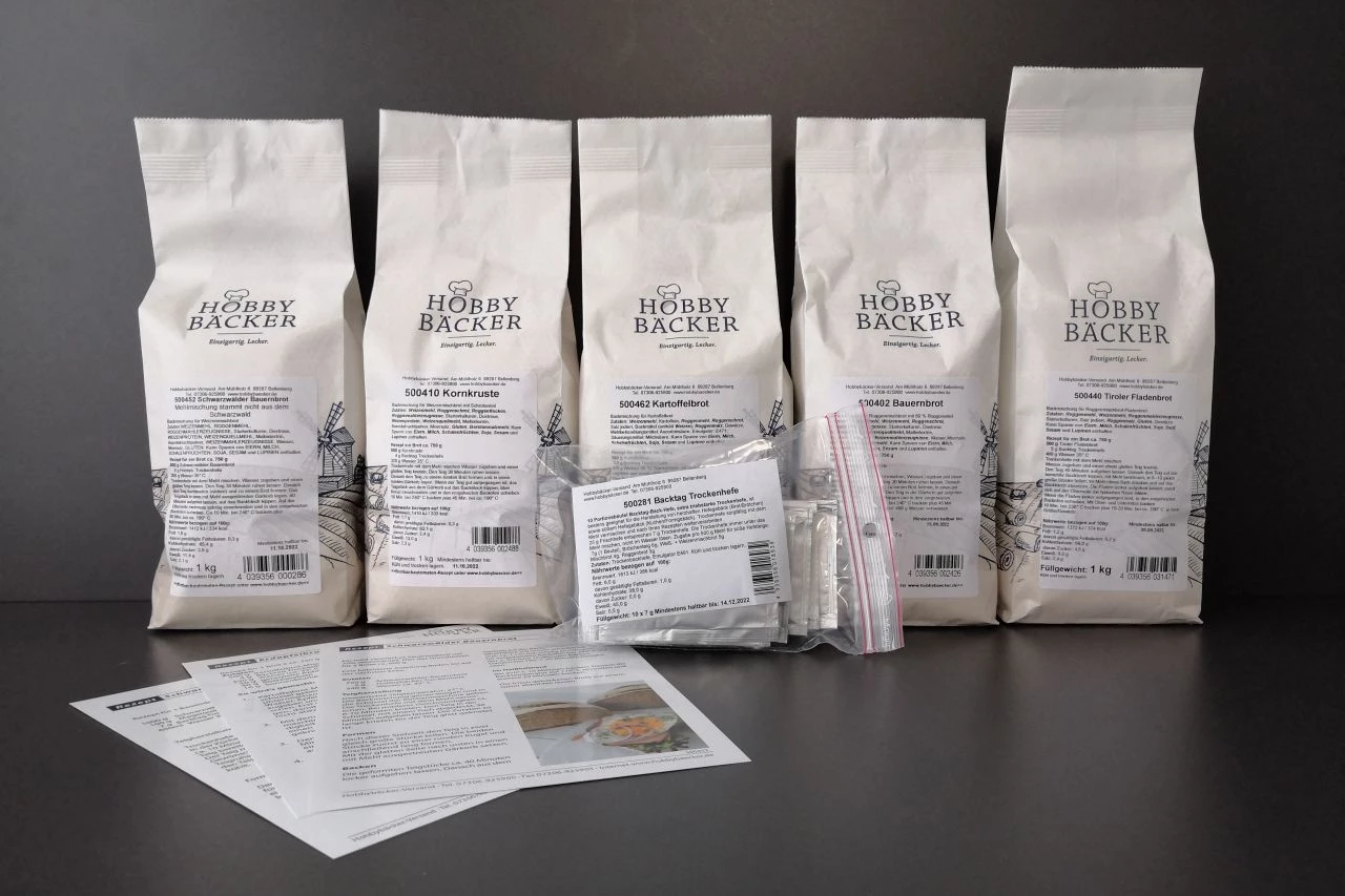 Im Geschenk-Set enthalten ist je 1 Kilogramm Bauernbrot, Kornkruste, Tiroler Fladenbrot, Kartoffelbrot, Schwarzwälder Bauernbrot und 7 Päckchen Backtag Trockenhefe. Zudem bekommen Sie verschiedene Rezeptvorschläge.