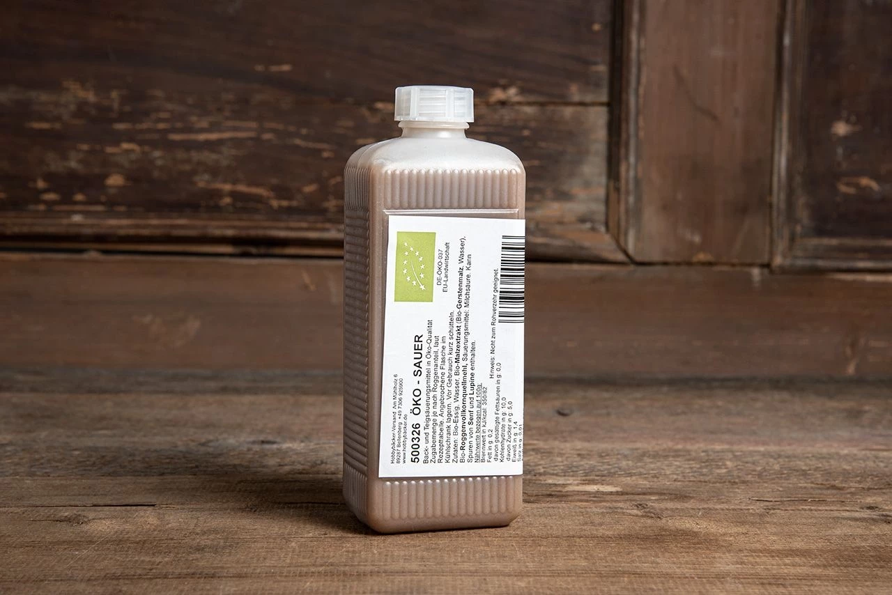 Öko-Sauer ist ein flüssiges Teigsäurungsmittel in Öko-Qualität zur Herstellung von allen Broten mit einem Anteil an Roggen. Es ersetzt Sauerteig und ist immer zur Hand. Mit Öko-Sauer gebackene Brote krümeln nicht, lassen sich gut aufschneiden und gut bestreichen. Sie halten lange frisch und schmecken abgerundet aromatisch. Sparsam im Verbrauch, nur 20 bis 80 g für 1,5 kg Brot. Mit der Zugabemenge steuern Sie den gewünschten, säuerlichen Geschmack: Geringere Zugabemenge bei hellen Mehlen und kleinen Broten mit milderem Sauerteiggeschmack. Höhere Zugabemenge bei dunklen Mehlen, Vollkornmehlen und großen Broten (Bauernlaib) mit kräftigerem Sauerteiggeschmack. 10 g Ökosauer ersetzen ca. 100 g Sauerteig.