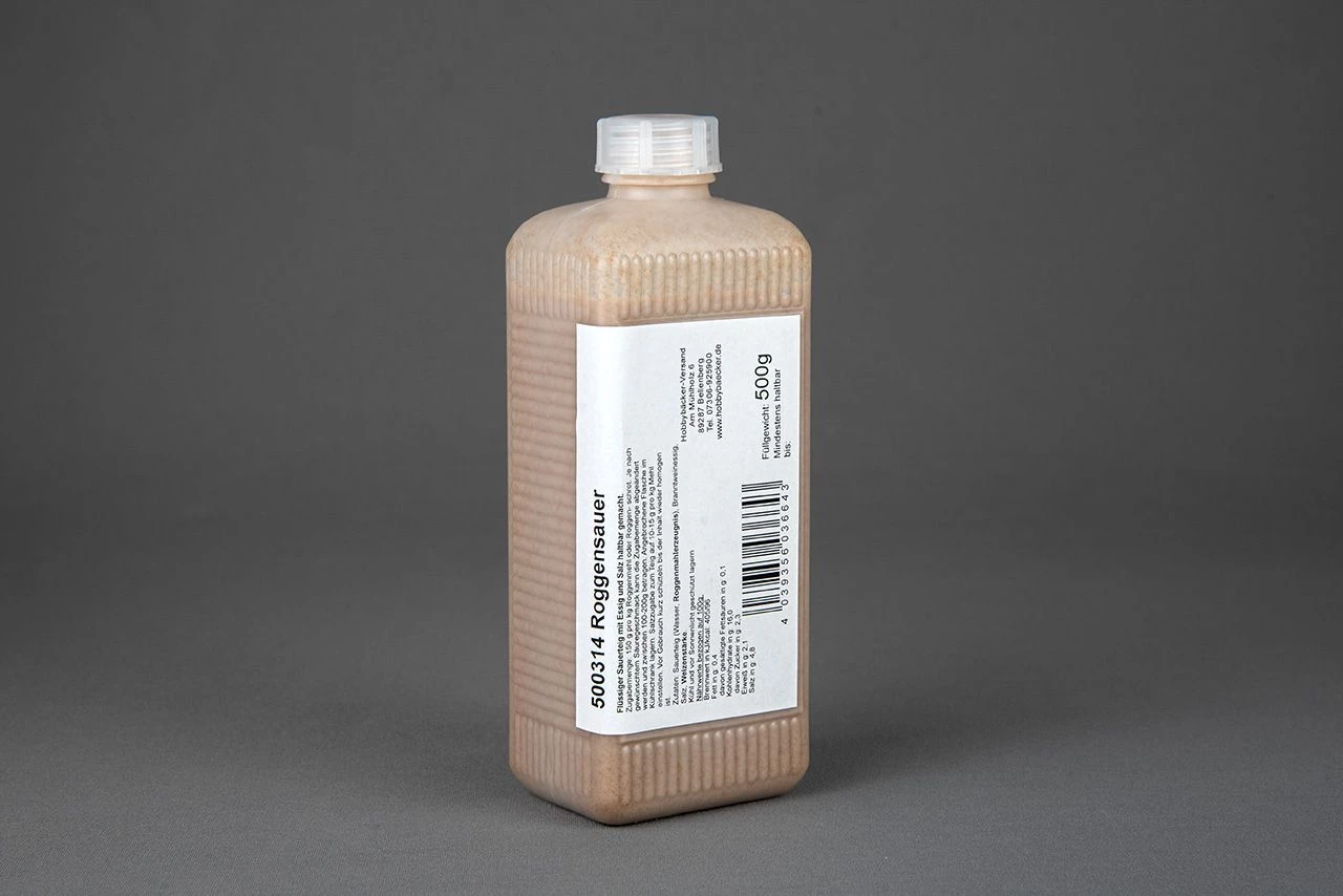 Der Mühlholzer Roggensauer sorgt für beste Brotqualität und ist durch seine flüssige Konsistenz leicht zu dosieren. Er verfügt über ein optimales Milch-Essigsäure-Verhältnis. Haltbar gemacht wurde er aus der klassischen Dreistufen-Führung ohne Erhitzen. Er ist aus dem Kühlschrank heraus immer einsatzbereit und garantiert sichere und gleichbleibende Sauerteig-Qualität. Die fertigen Brote und Gebäcke erhalten einen typischen milden, säuerlich-aromatischen Geschmack. Zugabe: 150 g pro kg Roggenmehl oder Roggenschrot. Je nach gewünschtem Säuregeschmack kann die Zugabemenge abgeändert werden und zwischen 100 – 200 g betragen.