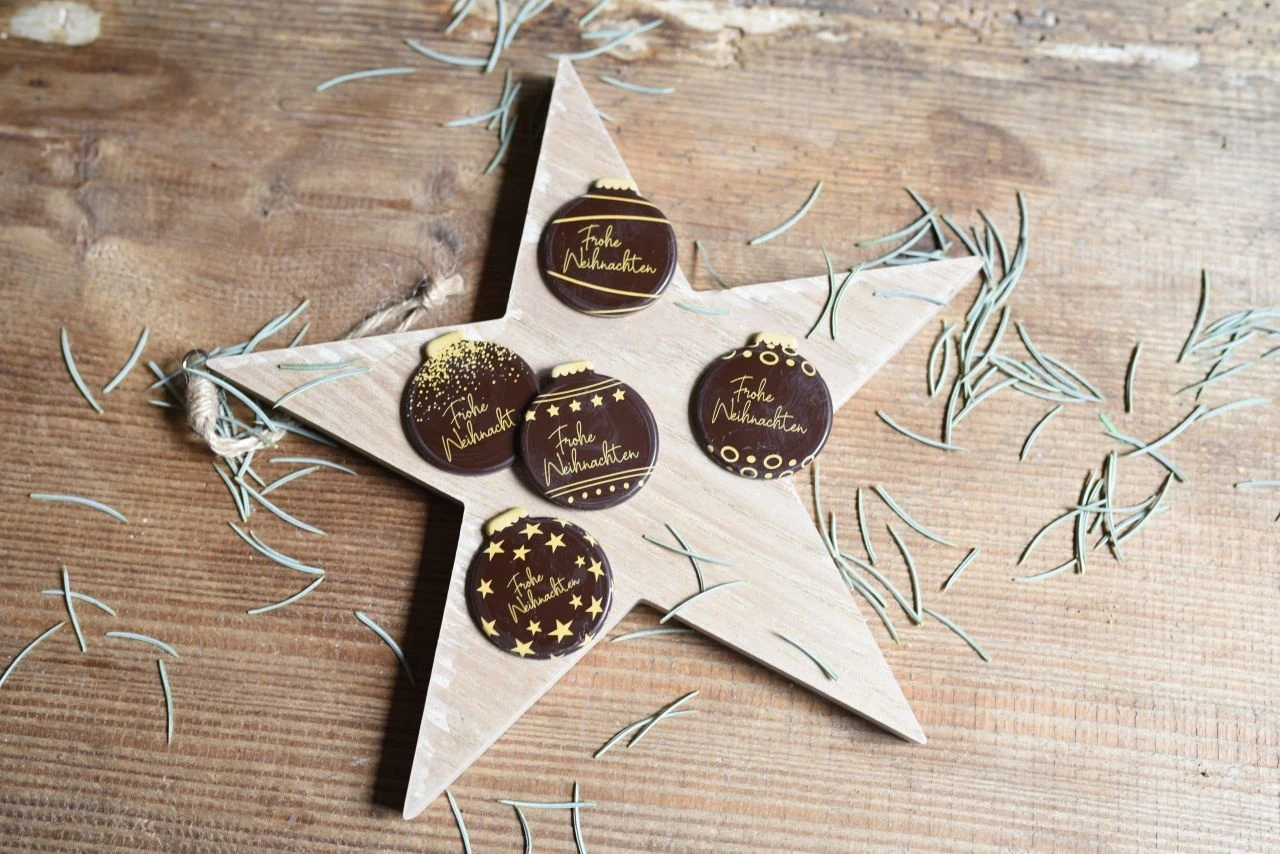 Weihnachtskugeln aus himmlischer Zartbitter-Schokolade mit edler, goldfarbener Verzierung und dem Schriftzug Frohe Weihnachten, lassen Ihren Gabentisch in vollem Glanz erstrahlen. Ob als Tortendekoration, auf winterlichen Desserts oder einfach auf dem Tellerrand als kleine Botschaft. Mit diesen Auflegern ist Ihnen eine weihnachtliche Stimmung garantiert.