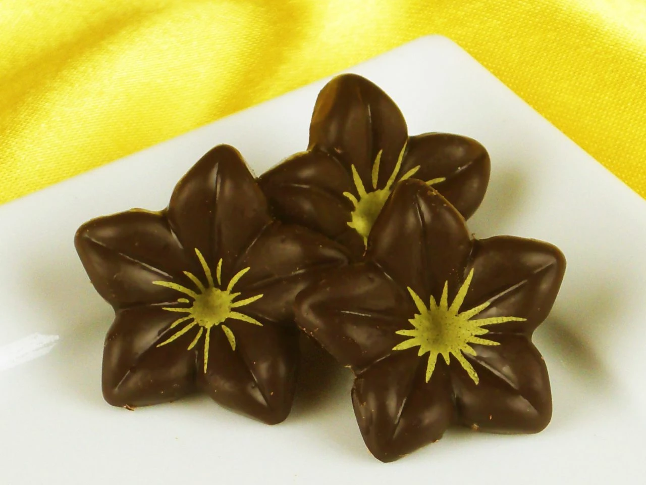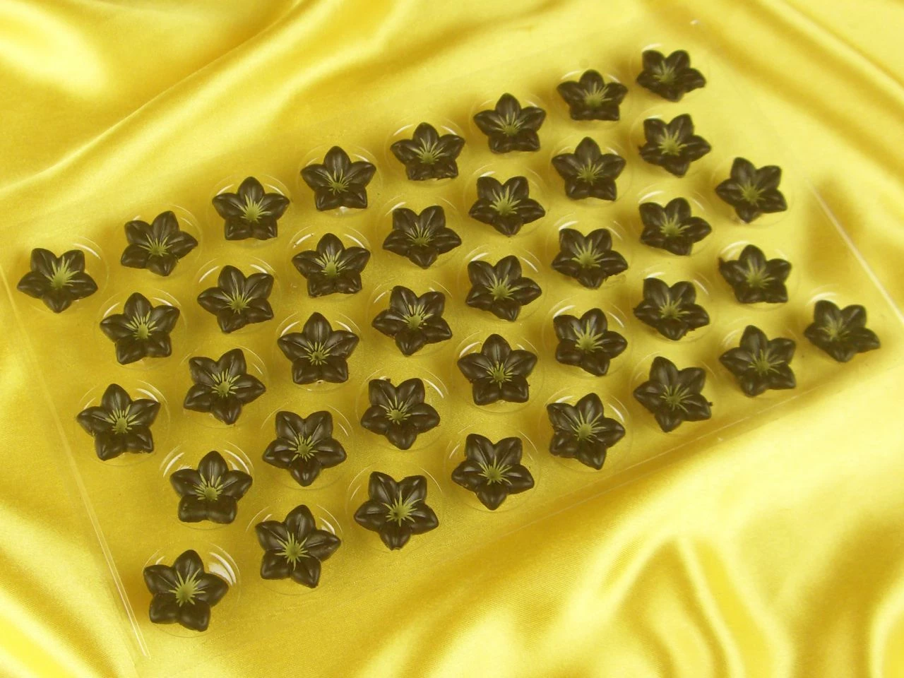 Verzieren Sie Ihre Torten, Desserts, Cupcakes und Eisbecher mit Schoko-Dekor: Blüte aus Zartbitterschokolade. Sie erhalten die hübschen Schoko-Blumen mit gelbem Stempel auf einer Folie mit 38 Stück. Eine glutenfreie Blüte aus Zartbitterschokoladen-Kuvertüre misst 2,5 cm im Durchmesser und 1,4 cm in der Höhe.