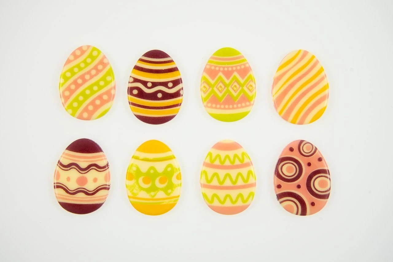 Schokoaufleger Ostereier aus feinster weißer Kuvertüre mit tollen Mustern