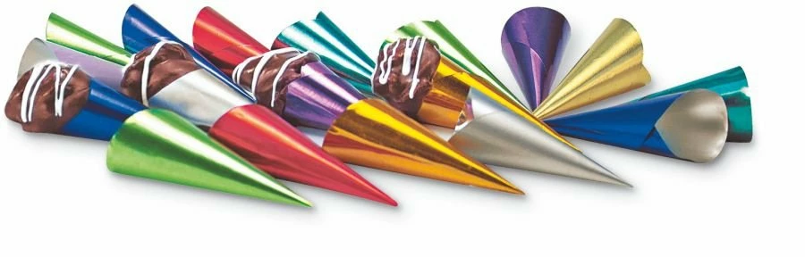 Füllen Sie Trüffelmasse in diese farbigen Spitztüten – das peppt Ihre Pralinenauswahl sofort originell und witzig auf. Aus Aluminiumfolie.