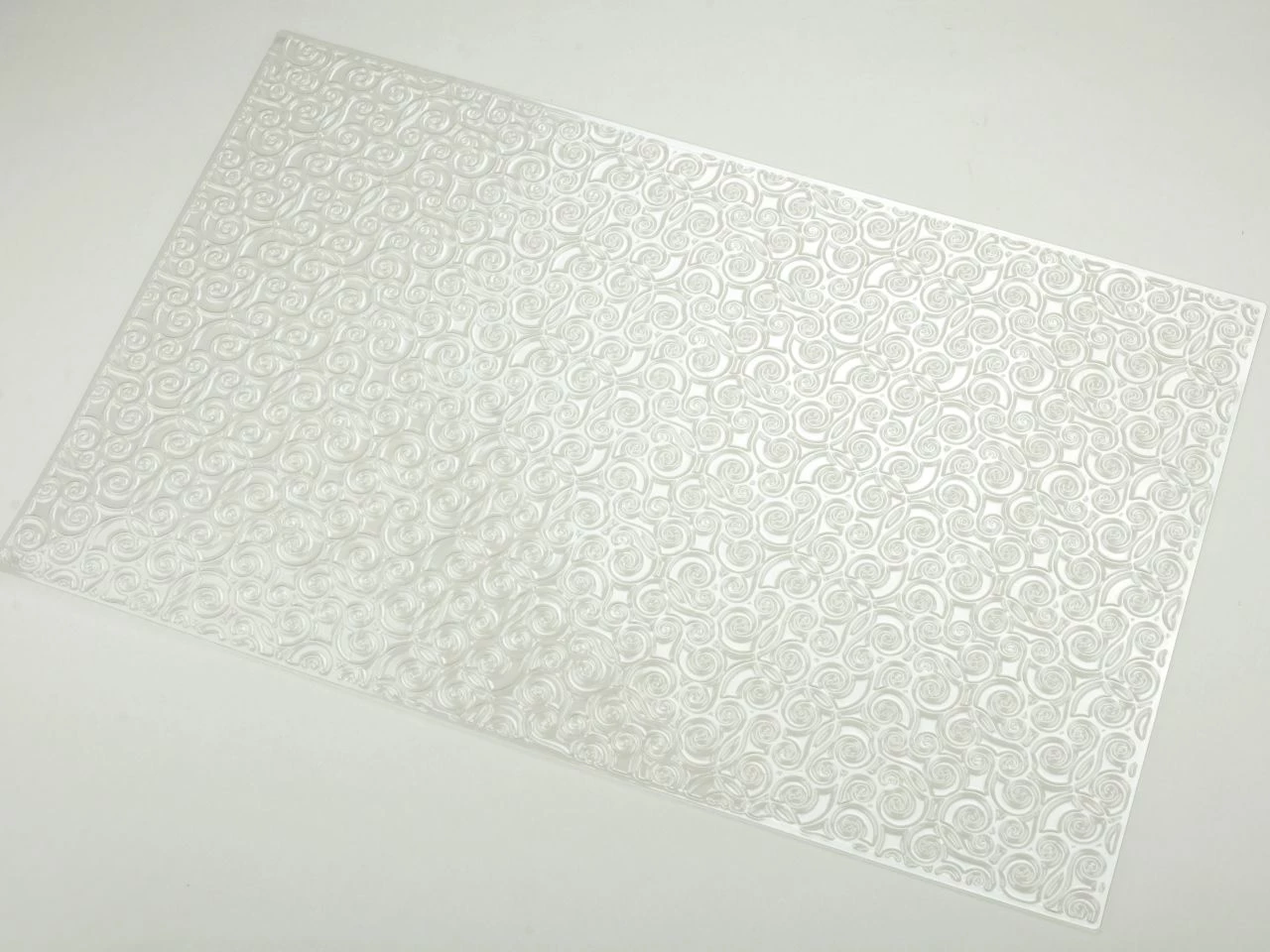 - Bei Torten und Dessert werden diese umgekehrt auf die Reliefmatte gesetzt und eingefroren. Nach dem Durchfrosten kann die Strukturfolie entfernt und wiederverwendet werden. Die Polyvinylchlorid-Folie bitte von Hand reinigen.