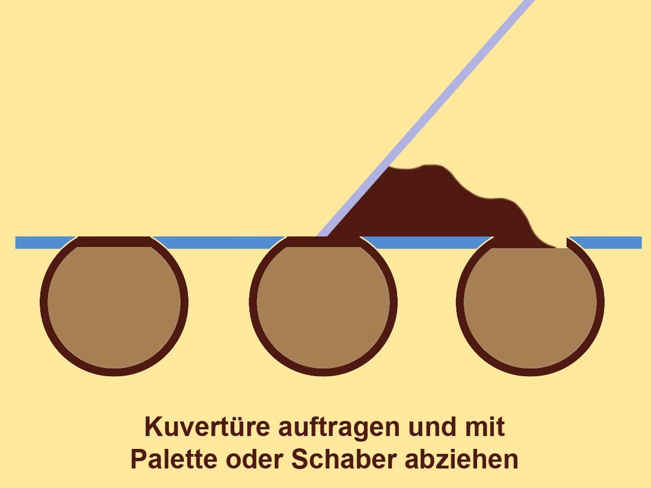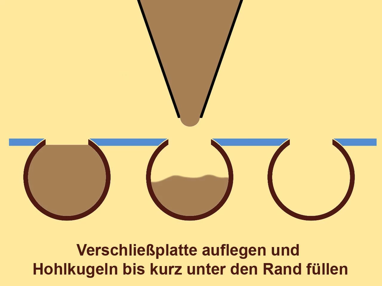 Das Auflegen der Platte vor dem Füllen ist auch möglich und das Bekleckern der Pralinen beim Befüllen ist ausgeschlossen. Trotzdem müssen die Hohlkörper einzeln mit Spritzbeutel oder Spritzflasche gefüllt werden, da sonst die Füllung zu hoch wird und das Schließen der Hohlkörper nicht mehr möglich ist.